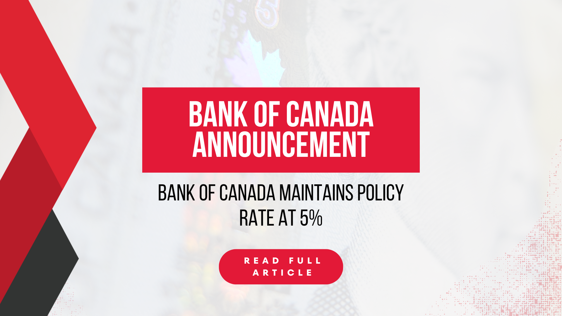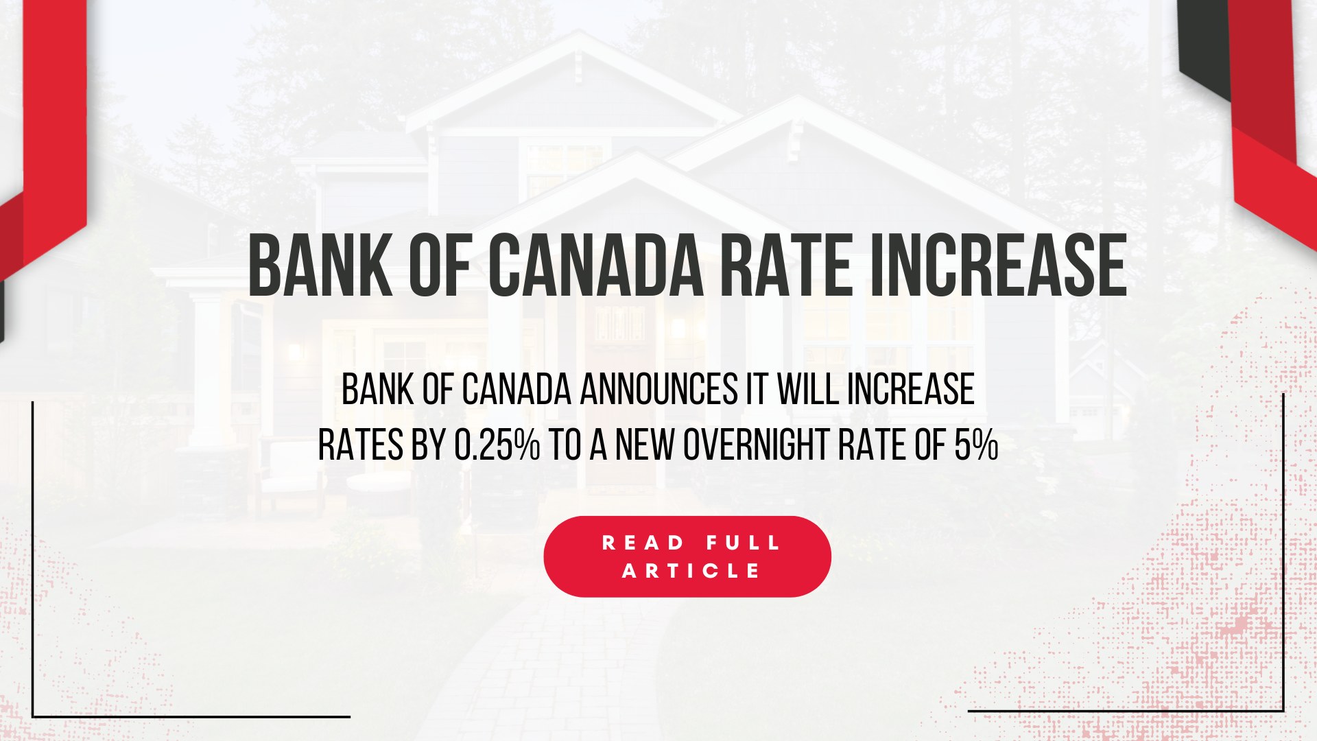 Bank of Canada raises interest rates by 0.25% to a new overnight rate of 5%.