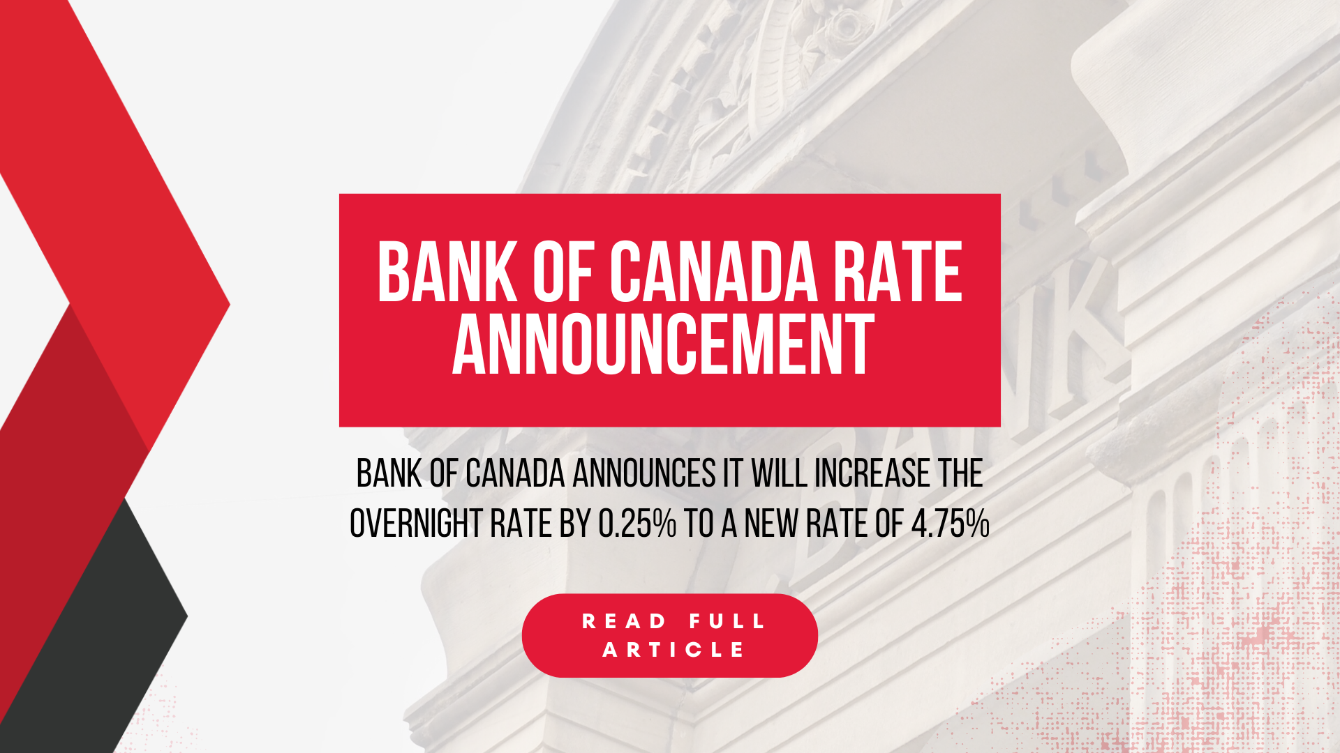 Bank of Canada announces 0.25% increase to a new overnight rate of 4.75%.