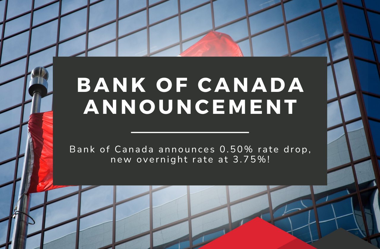 The Bank of Canada announces 0.50% rate drop, to new overnight rate of 3.75%.